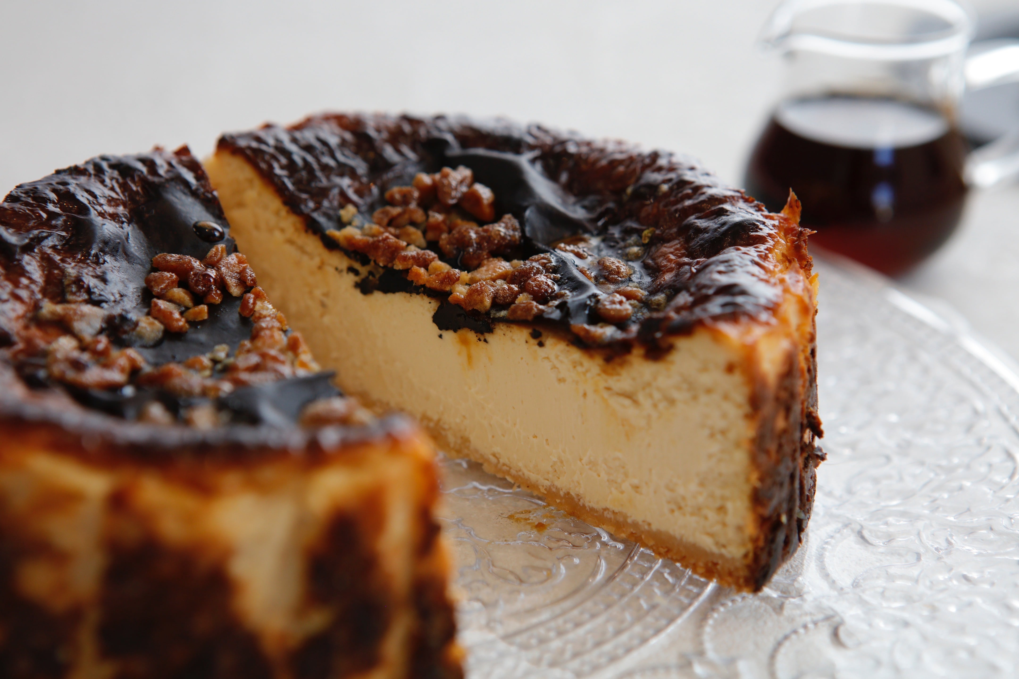 表面にキャラメルのザラメをふりかけて焦しました。メープルシロップのコクとまろやかさと濃厚なクリームチーズ、とろけ出す焦がしキャラメルのバスクチーズケーキをお楽しみください。